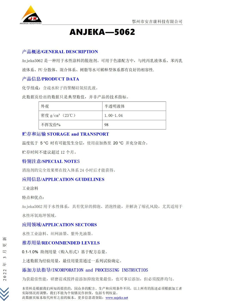 Anjeka5062是一種用于水性涂料的脫泡劑?捎糜谏崤浞街,與純丙乳液體系、苯丙乳液體系、PU分散體、混合體系、樹脂等水可稀釋型體系都有良好的相容性