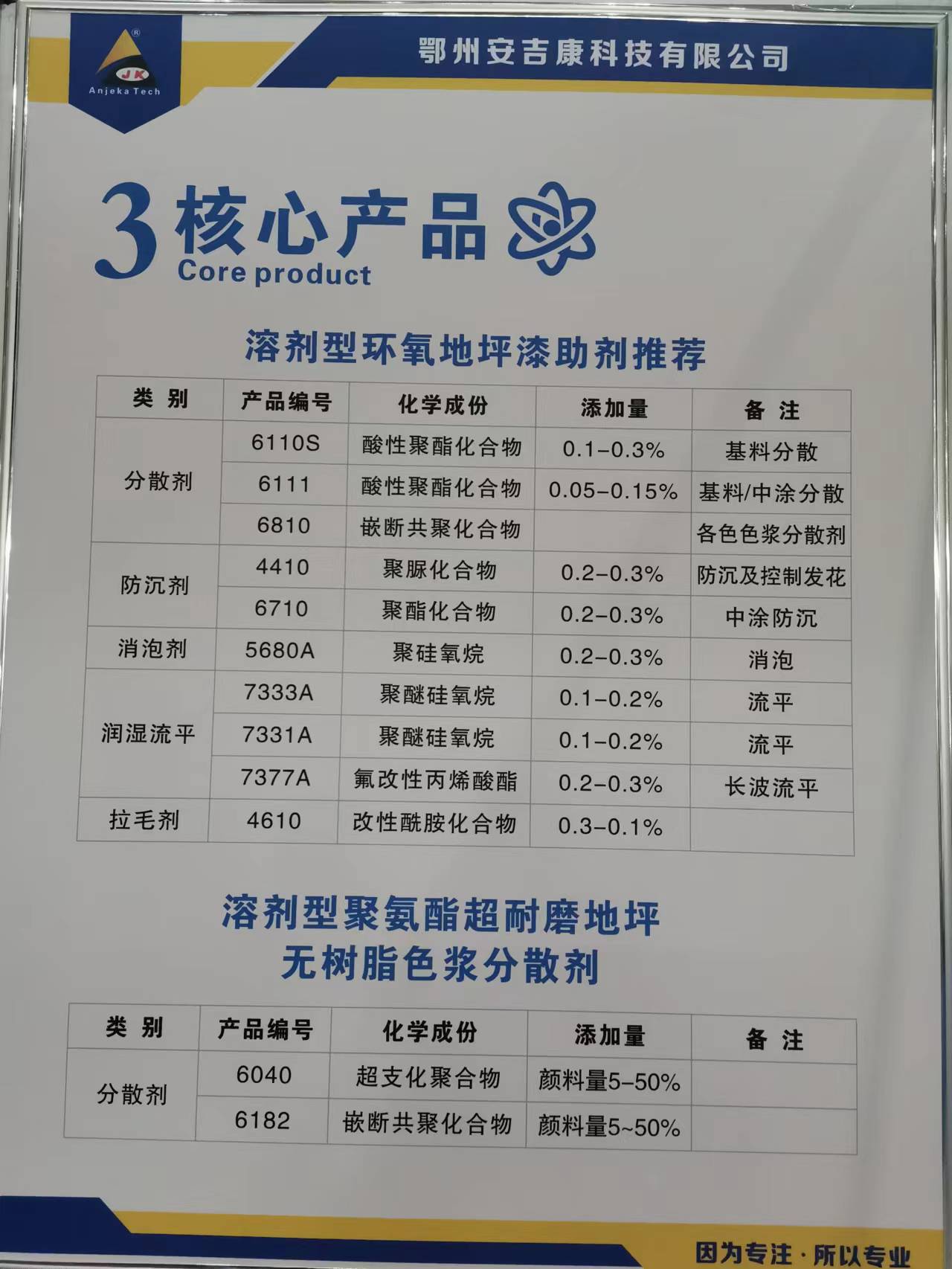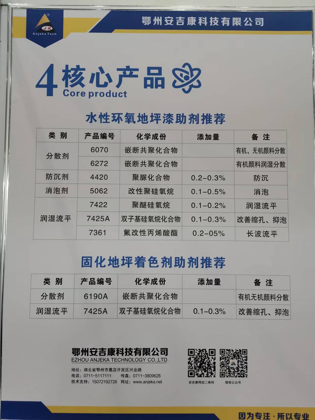 安吉康有一整套的地坪漆助劑解決方案,包含:分散劑、消泡劑、防沉劑,潤濕流平劑等